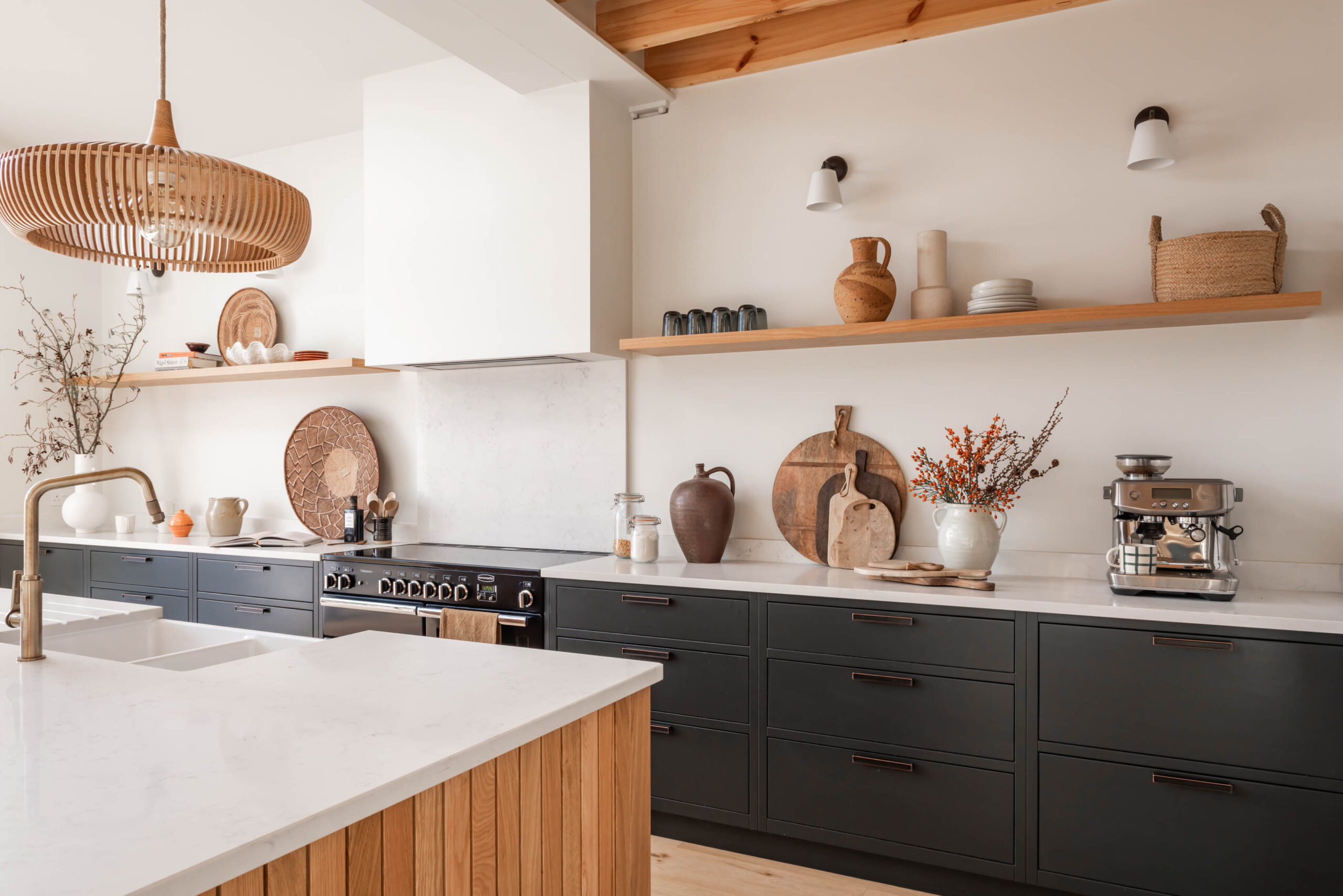 Tủ bếp, được lựa chọn từ dòng sản phẩm Fusion của chúng tôi, có thiết kế mặt trước phẳng, đơn giản với khung viền chìm. Các tủ chính được sơn màu Lamp Black của Little Greene, tạo nên sự tương phản nổi bật với tông màu gỗ tự nhiên của đảo bếp. Sự kết hợp tinh tế này mang lại chiều sâu và sự cân bằng, pha trộn phong cách hiện đại với các yếu tố tự nhiên để phản ánh tình yêu của chủ nhà đối với vật liệu tự nhiên.
